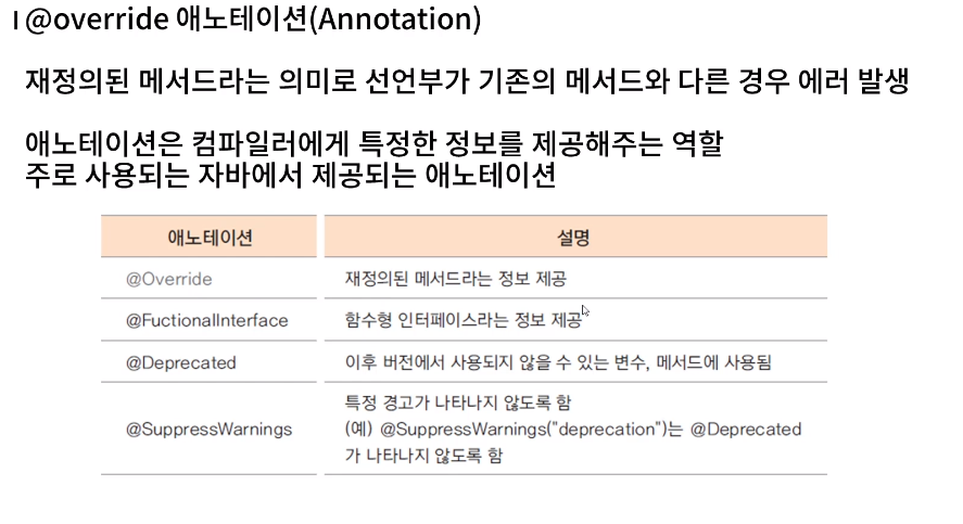 : 상위 클래스에 정의된 메서드의 구현 내용이 하위 클래스에서 구현할 내용과 맞지 않는 경우 하위 클래스에서 동일한 이름의 메서드를 재정의 할 수 있음.