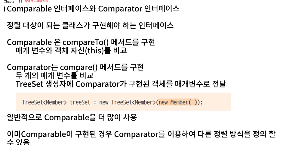 객체 비교를 위해 comparable 이나 comparator 인터페이스를 구현해야함.