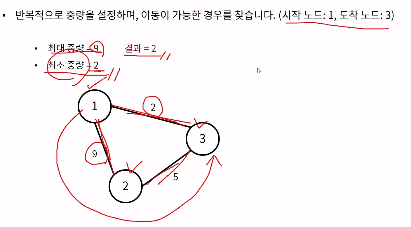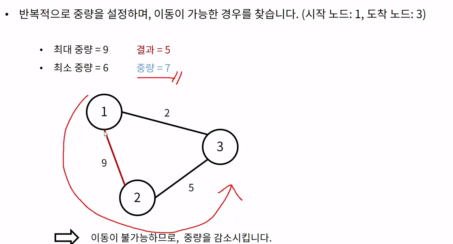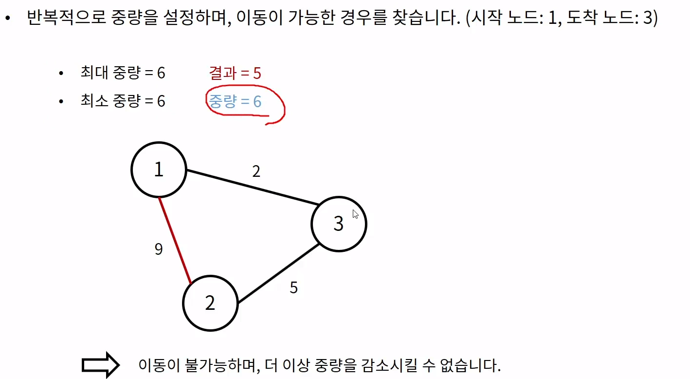 영식 중공업에서는 두 개의 섬에 공장을 세워 두고 물품을 생산하는 일을 하고 있다. 물품을 생산하다 보면 공장에서 다른 공장으로 생산 중이던 물품을 수송해야 할 일이 생기곤 한다. 그런데 각각의 다리마다 중량제한이 있기 때문에 무턱대고 물품을 옮길 순 없다. 만약 중량제한을 초과하는 양의 물품이 다리를 지나게 되면 다리가 무너지게 된다.
