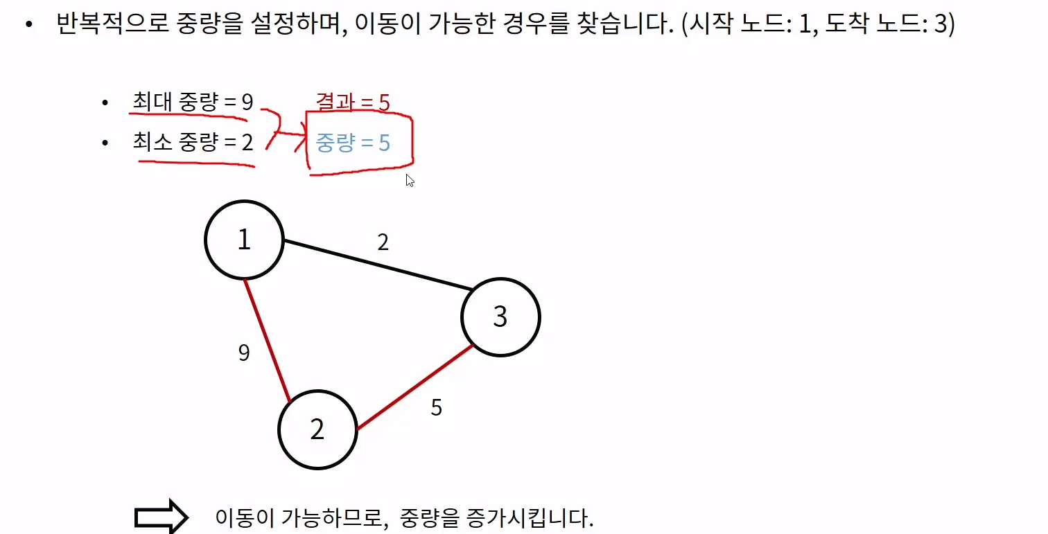 if bfs(mid): # 이동이 가능하므로 중량을 증가시킵니다.