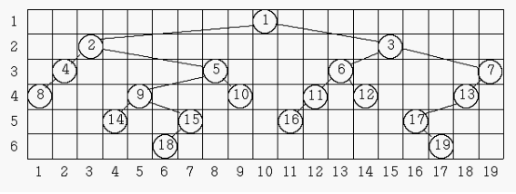 이진트리를 다음의 규칙에 따라 행과 열에 번호가 붙어있는 격자 모양의 틀 속에 그리려고 한다. 이때 다음의 규칙에 따라 그리려고 한다.