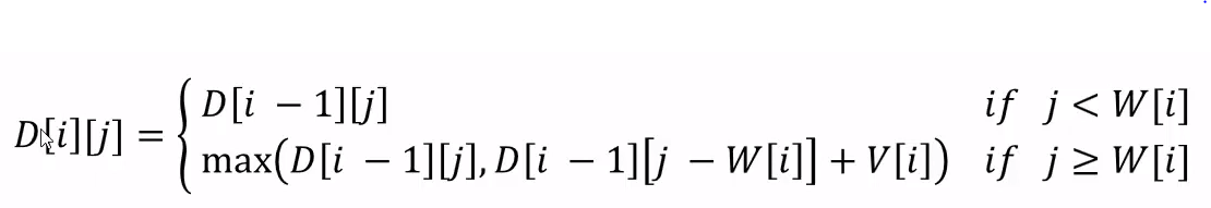D[i][j] = 배낭에 넣은 물품의 무게 합이 j 일때 얻을 수 있는 최대 가치