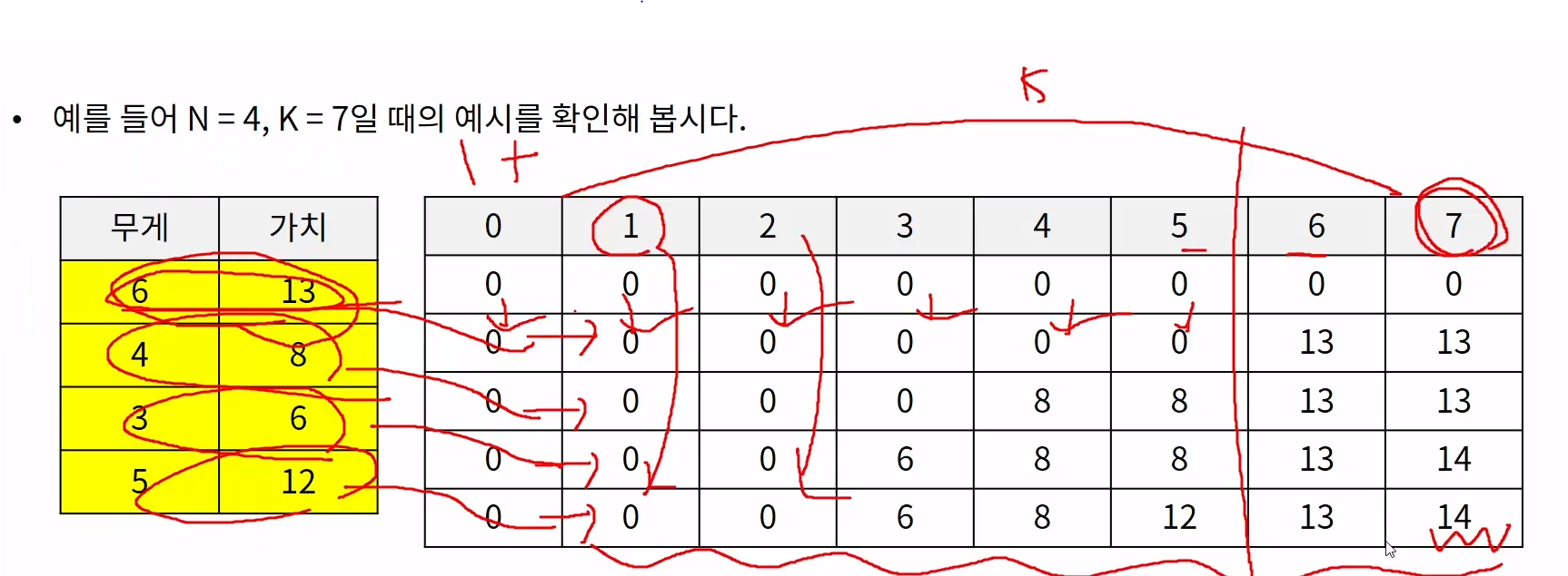 각 물품 번호 i 에 따라서 최대 가치 테이블 D[i][j]를 갱신하여 문제를 해결할 수 있다.
