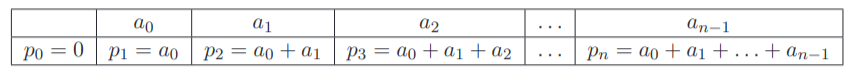 마찬가지로 k 마지막 값의 합계인 접미사 합계를 계산할 수 있다. prefix (or suffix) sums 을 사용하는 것은 우리에게 배열의 부분합을 더 빨리 계산하게 돕는다. 예를 들어, 배열 A의 A[x:y+1]의 합을 구한다 생각하자.( ax + ax+1 + ax+2 + ax+3 + ax+4 +ax+5 + ax+6 + ... + ay-1 + ay