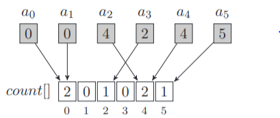 모든 요소가 {0, 1, . . . . m} 집합에 있다는 것을 알게 되면, 카운트에 사용되는 배열은 m + 1 사이즈여야 한다.