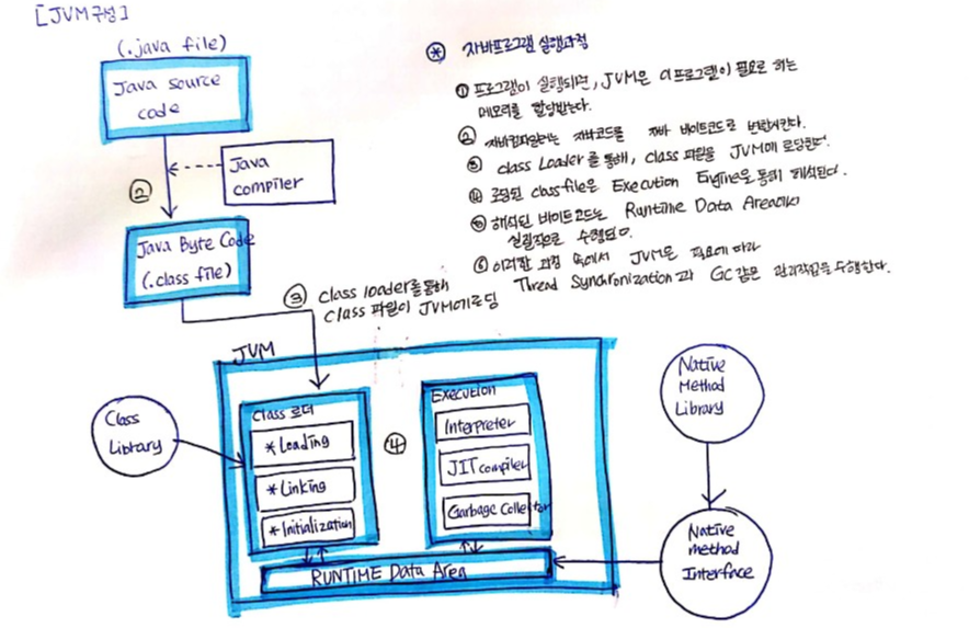 - 해석된 바이트코드는 RunTime Data Areas 에 배치되어 실질적인 수행이 이뤄지게 된다. 이러한 실행 과정 속에서 JVM 은 필요에 따라 Thread Synchronization 과 GC같은 관리 작업을 수행한다.