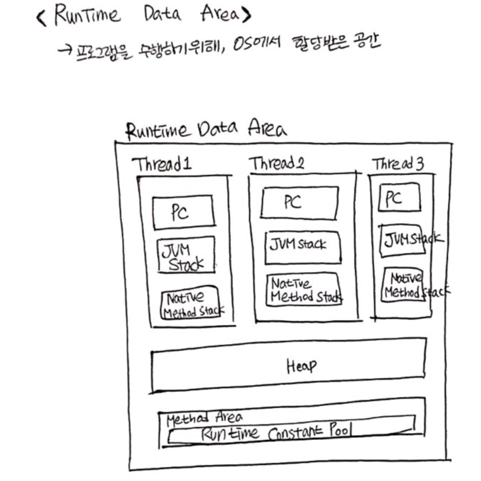 - 프로그램이 실행되면, JVM 은 OS 로 부터 이 프로그램이 필요로 하는 메모리를 할당받는다. JVM 은 이 메모리를 용도에 따라 여러 영역으로 나눠 관리한다.