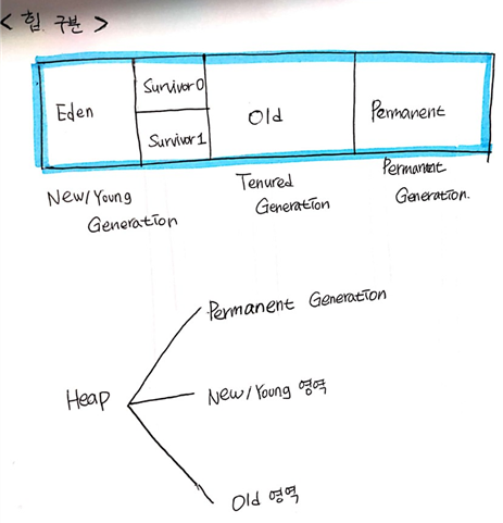 객체를 저장하는 가상메모리 공간이다. new 연산자로 생성된 객체의 배열을 저장한다.물론 class area 영역에 올라온 클래스들만 객체로 생성할 수 있다. 힙은 세 부분으로 나눌 수 있다.