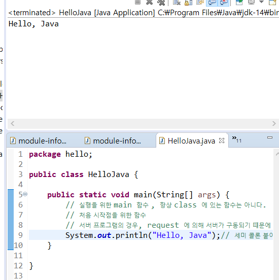 System.out.println("Hello, Java");// 세미 콜론 붙이기