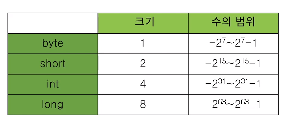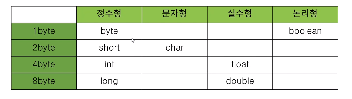 - 기본형 : 자바 언어에서 기본적으로 제공해주는 자료형, 메모리의 크기가 정해져 있다. 정수형 문자형, 실수형, 논리형