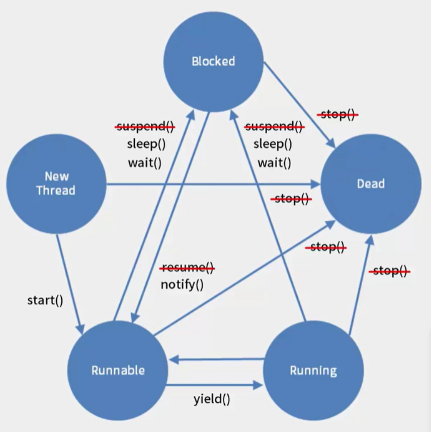 Thread.sleep()이나 Object가 가지고 있는wait()메소드가 호출이 되면 쓰레드는Blocked상태가 됩니다. Thread.sleep()은 특정시간이 지나면 자신 스스로 블록상태에서 빠져나와Runnable이나Running상태가 됩니다.- Object가 가지고 있는