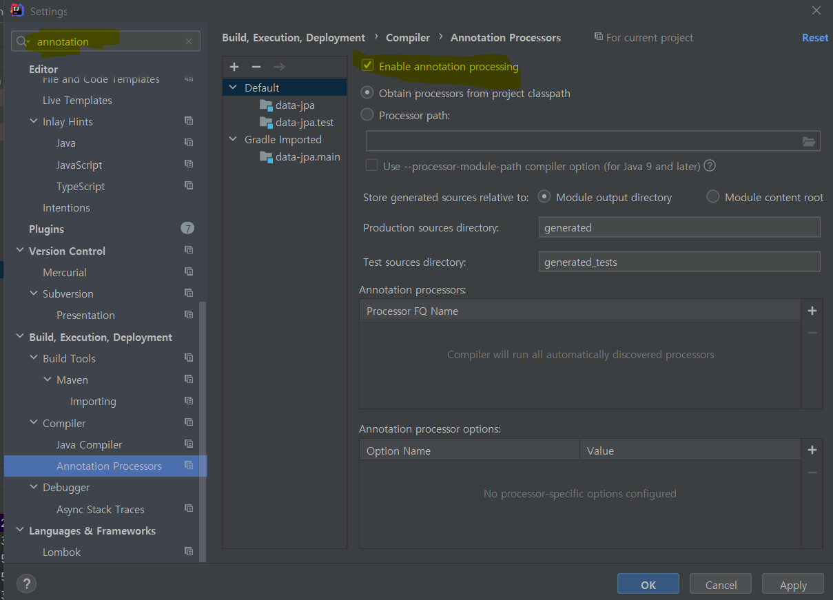 Annotation Processors검색➡ Enable annotation processing 체크 (재시작) - 임의의 테스트 클래스를 만들고