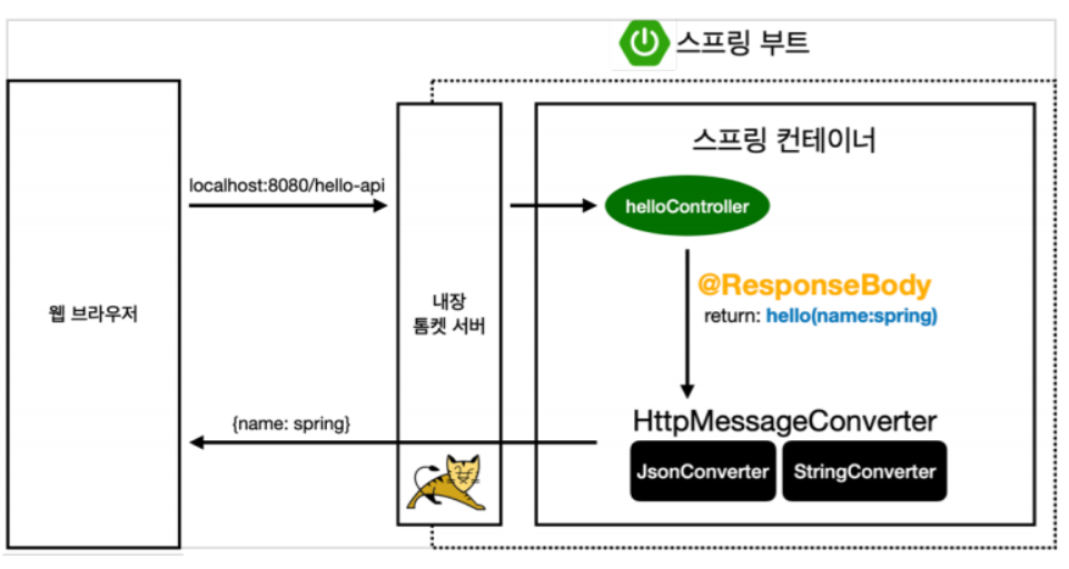 }@ResponseBody를 사용하면 뷰리졸버(viewResolver)를 사용하지 않음.(=http 응답 body 에 이 리턴값을 직접 넣어주겠다.)- 대신에 HTTP 의 BODY 에 문자 내용을 직접 반환(HTML BODY TAG 를 말하는 것이 아님.)