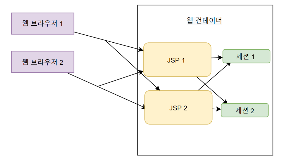 '웹 컨테이너'는 기본적으로 한 웹 브라우저 마다 한 세션을 생성한다. 즉, 같은 JSP 페이지라도 웹 브라우저에 따라 서로 다른 세션을 사용하낟.
