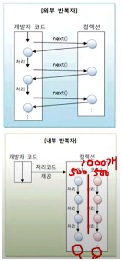 내부 반복자를 사용하므로 병렬처리가 쉽다.