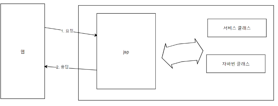 Jsp 웹 어플리케이션 구조는 크게 모델1 구조와 모델2 구조로 나뉜다. 이는 jsp 에서 모든 호직과 출력을 처리하느냐 아니면 jsp 에서 처리하냐의 차이이다.
