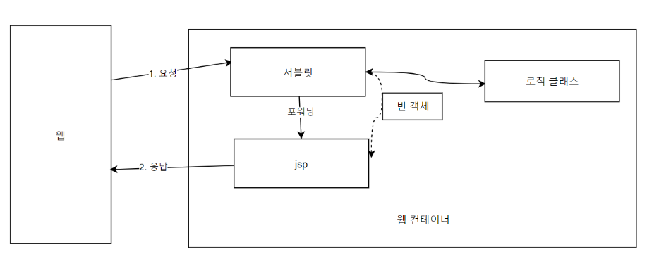 - 모델: 비즈니스 영역에 대한 로직을 처리한다. (로직 처리 클래스, 자바 빈)