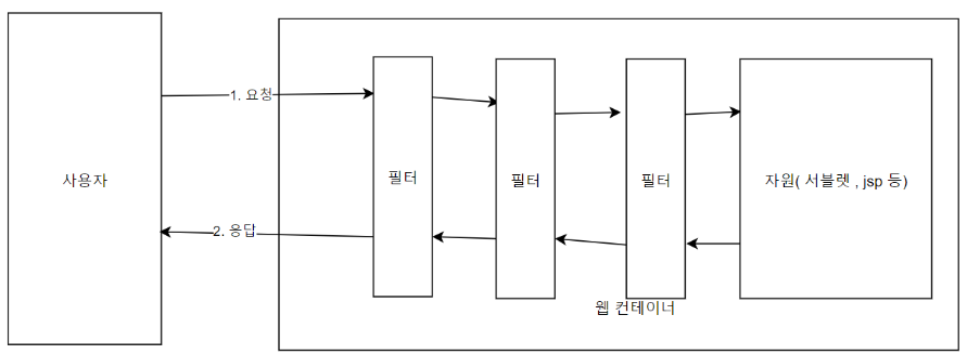 필터는 객체의 형태로 클라이언트에서 오는 요청과 최종 자원사이( 서블릿, Jsp ..) 에 위치해 클라이언트의 요청 정보를 변결 가능하다. 또한, 최종 자원과 클라이언트로 가는 응답 사이에 위치해 최종 자원의 요청 결과를 알맞게 변경할 수 있다.
