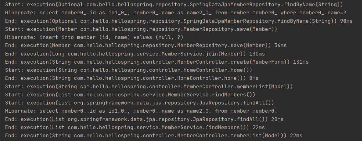 System.out.println("End: " + joinPoint.toString() + " " + timeMs + "ms");