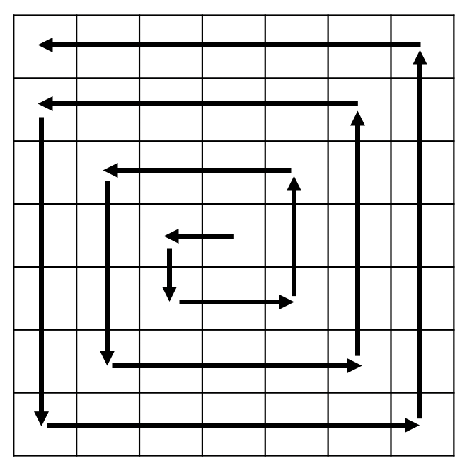 토네이도를 시전하면 격자의 가운데 칸부터 토네이도의 이동이 시작된다. 토네이도는 한 번에 한 칸 이동한다. 다음은 N = 7인 경우 토네이도의 이동이다.
