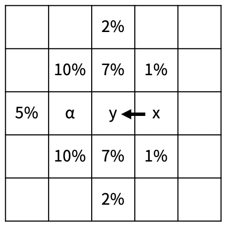 토네이도가 x에서 y로 이동하면, y의 모든 모래가 비율과 α가 적혀있는 칸으로 이동한다. 비율이 적혀있는 칸으로 이동하는 모래의 양은 y에 있는 모래의 해당 비율만큼이고, 계산에서 소수점 아래는 버린다. α로 이동하는 모래의 양은 비율이 적혀있는 칸으로 이동하지 않은 남은 모래의 양과 같다. 모래가 이미 있는 칸으로 모래가 이동하면, 모래의 양은 더해진다. 위의 그림은 토네이도가 왼쪽으로 이동할 때이고, 다른 방향으로 이동하는 경우는 위의 그림을 해당 방향으로 회전하면 된다.