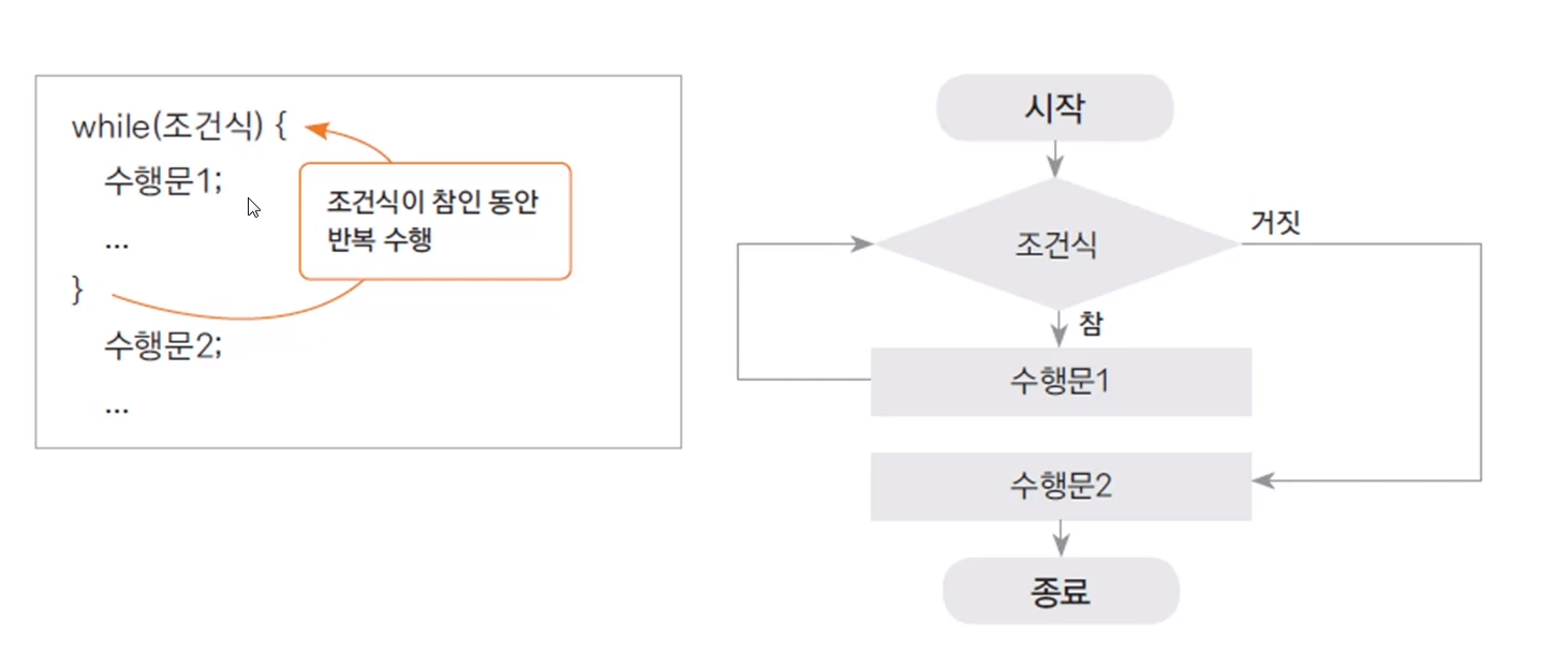 조건이 참인 동안 수행문이 반복해서 수행됨.