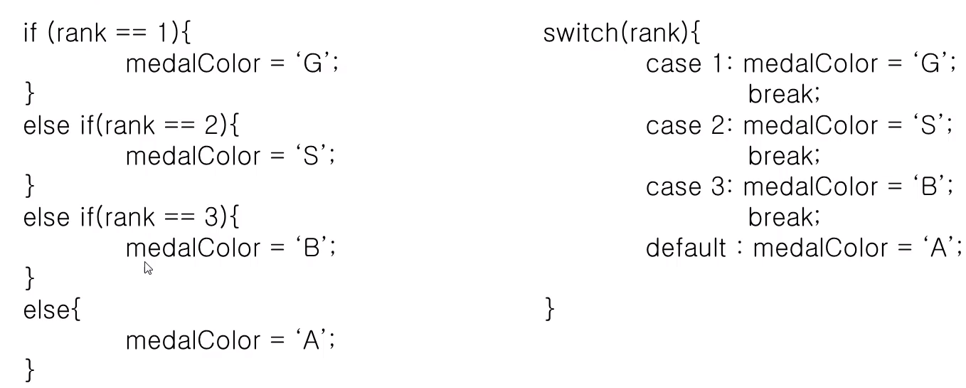 조건이 정수, 문자열 값으로 그 값에 따라 수행결과가 달라지는 경우, if-else if-else 와 같은 의미로 수행