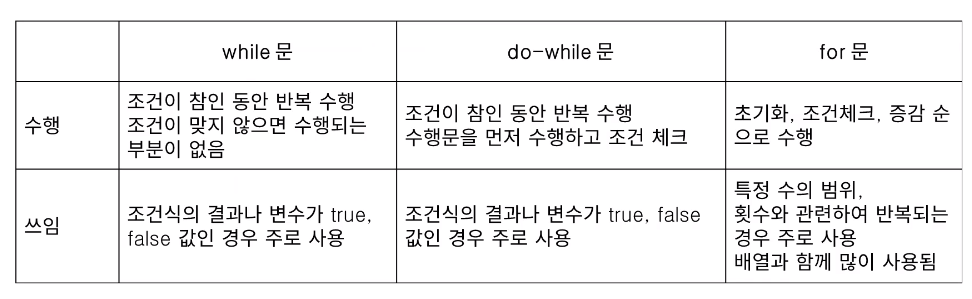 * 반복의 수행 중 조건문과 조건이 맞는 경우, 이후 블록 내부의 다른 수행문을 수행하지 않음.( 내가 주로 써야한다.)