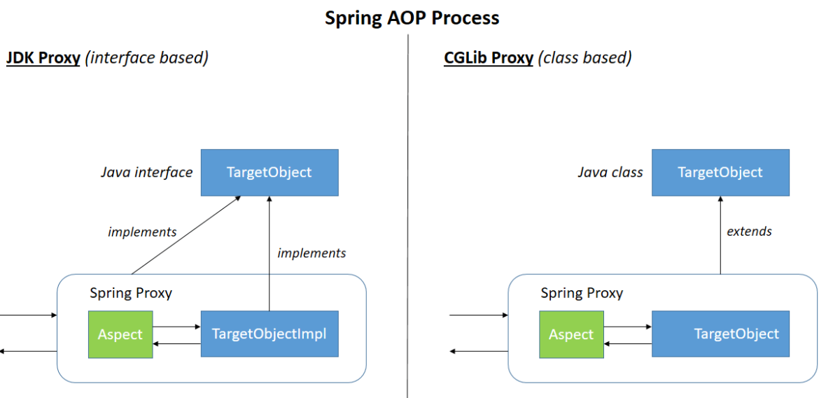 | 프록시는 대상 개체로 만들어지며 이러한 프록시에 측면이 적용 | 애플리케이션이 실행되기 전에 (런타임 전에) Aspect가 코드로 직접 짜여짐 |