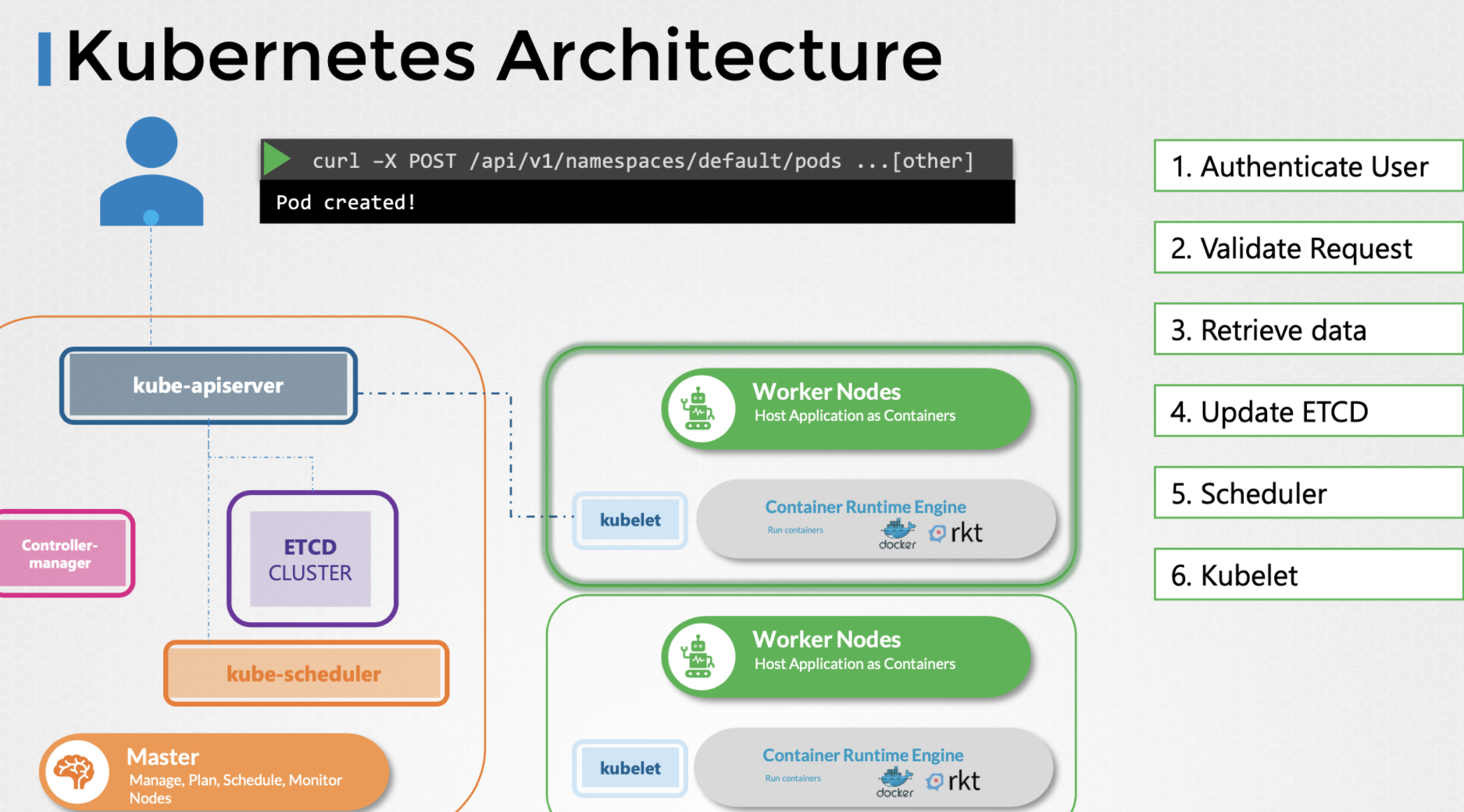 - kube api server 은 etcd 클러스터에 정보를 업데이트하고, api 서버는 이 정보를 적절한 워커 노드 kubelet 에 넘긴다.