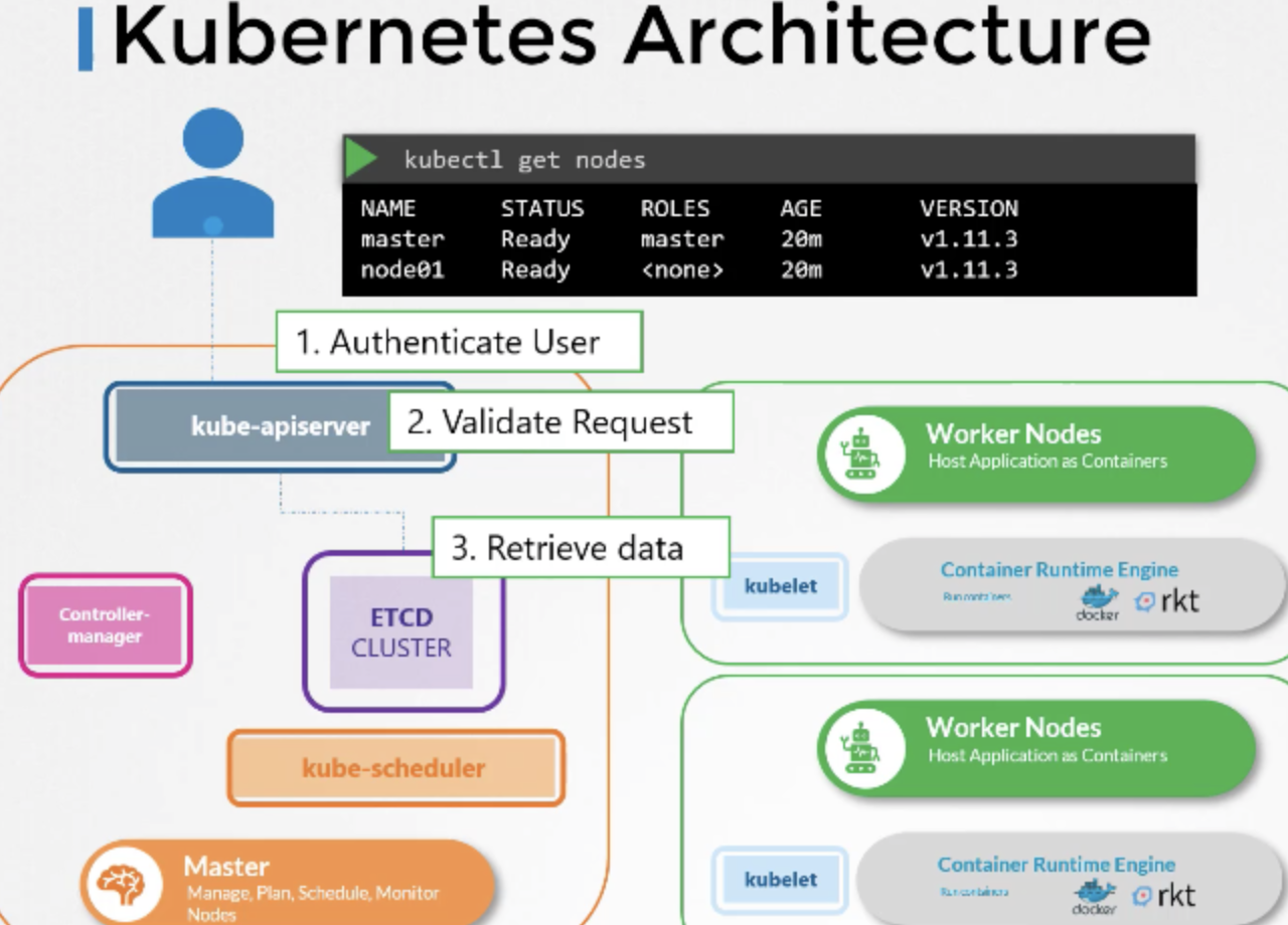 kubectl get nodes- kube-api server 는 먼저 요청을 인증하고, (1. Authenticate User)