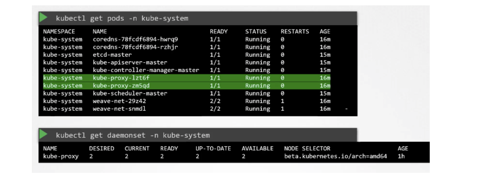 - kubeadm 은 kube-proxy 를 각 노드의 daemonset으로 배포하므로, 클러스터의 각 노드에는 항상 단일 pod 가 배포된다.