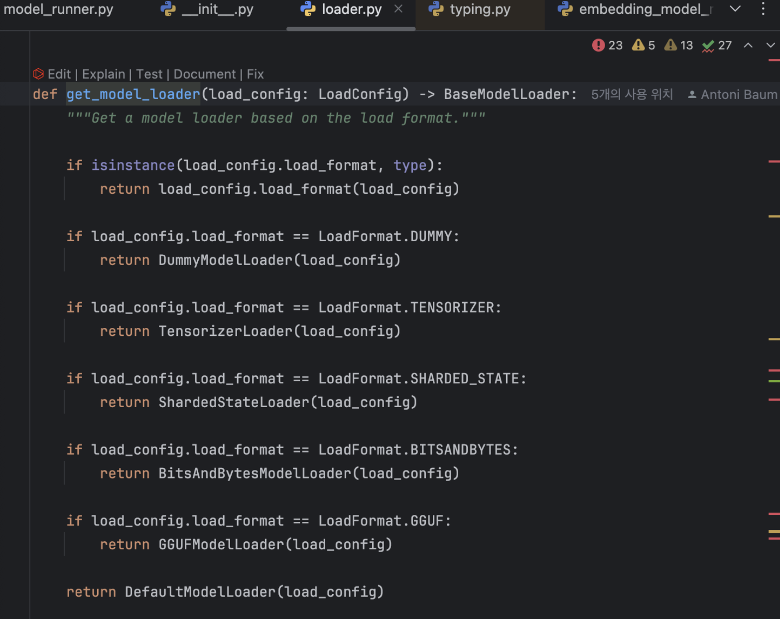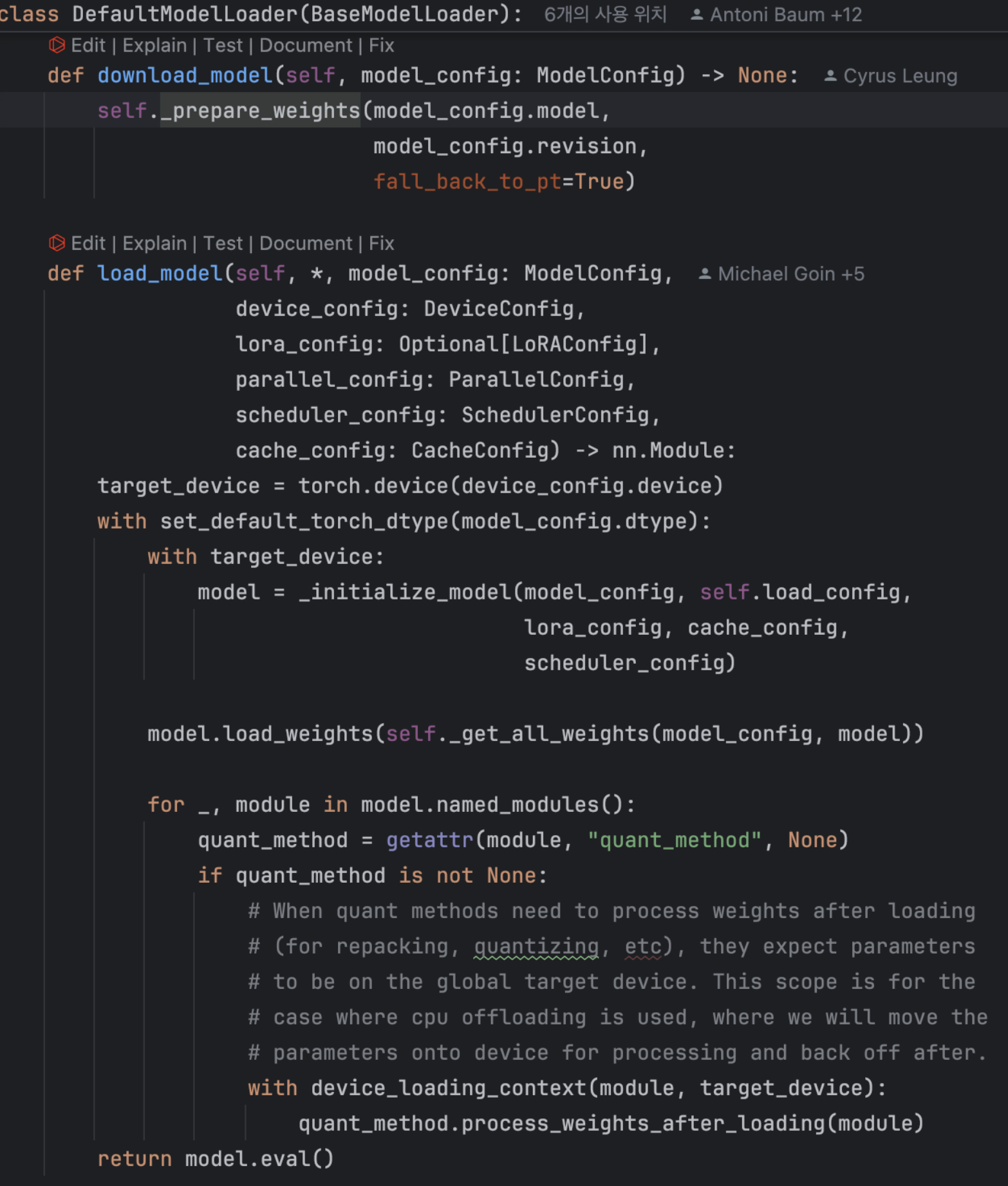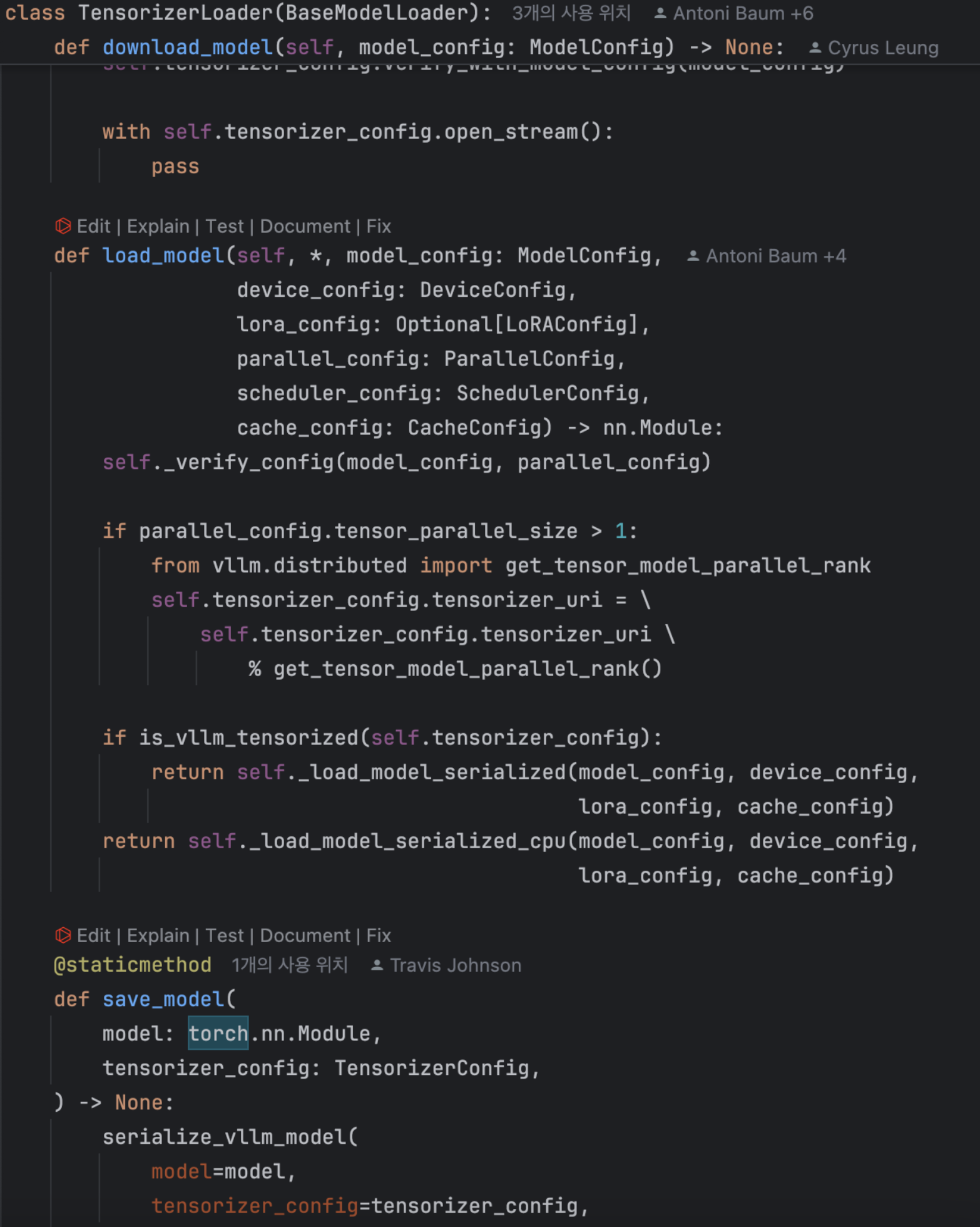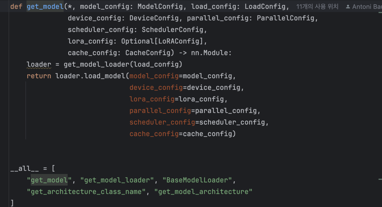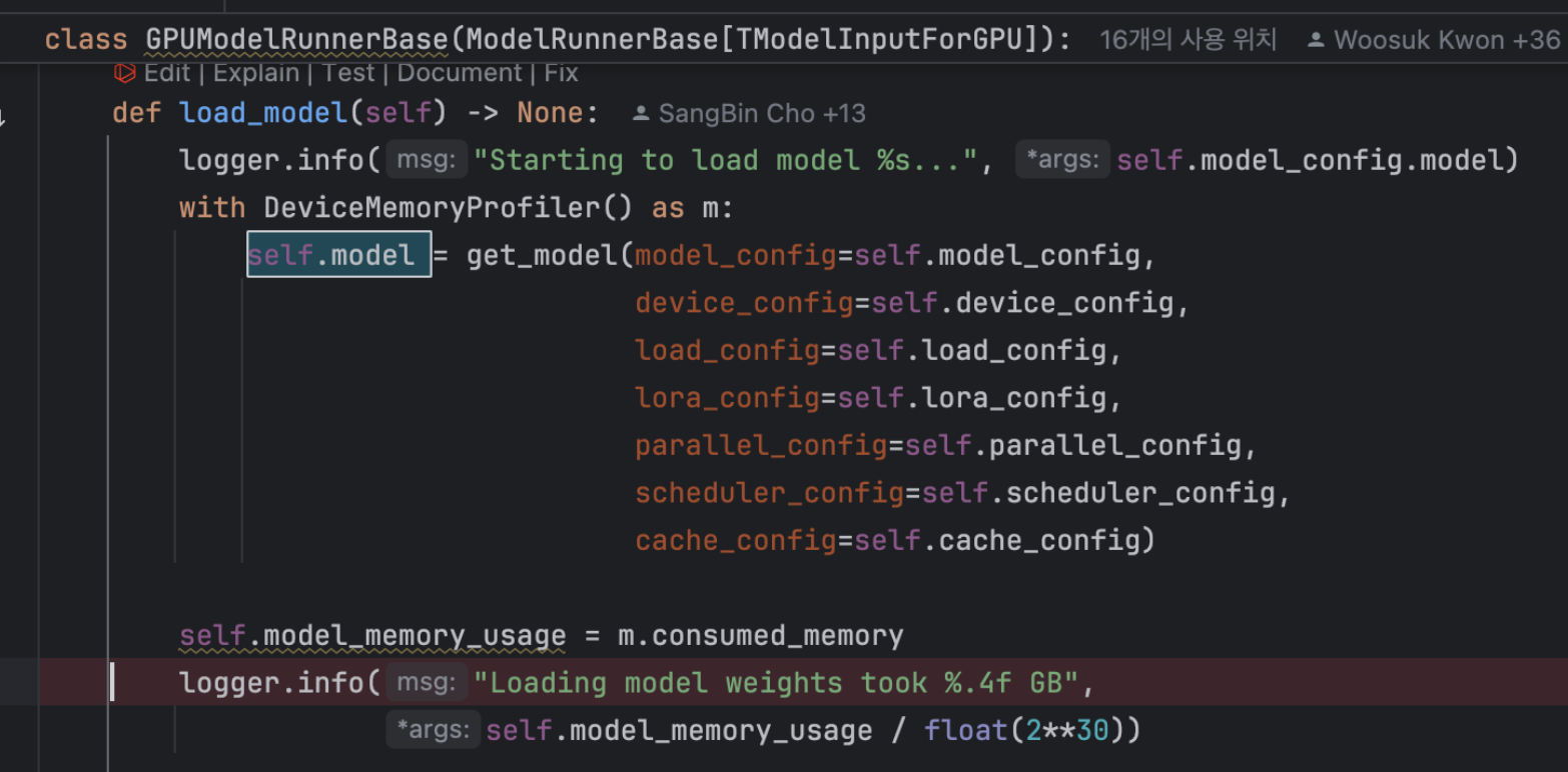 각 model runner 객체는 하나의 model 객체를 가지며, 이는 실제 torch.nn.Module 인스턴스입니다. 다양한 설정이 최종적으로 얻는 클래스에 어떻게 영향을 미치는지에 대한 내용은 Integration with HuggingFace 를 참조하세요.