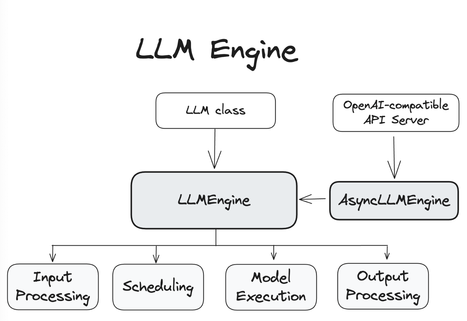 LLMEngine 클래스는 vLLM 엔진의 핵심 구성 요소로, 클라이언트로부터 요청을 수신하고 모델로부터 출력을 생성하는 역할을 담당합니다. LLMEngine은 입력 처리, 모델 실행(여러 호스트와/또는 GPU에 분산 가능), 스케줄링, 출력 처리를 포함합니다.
