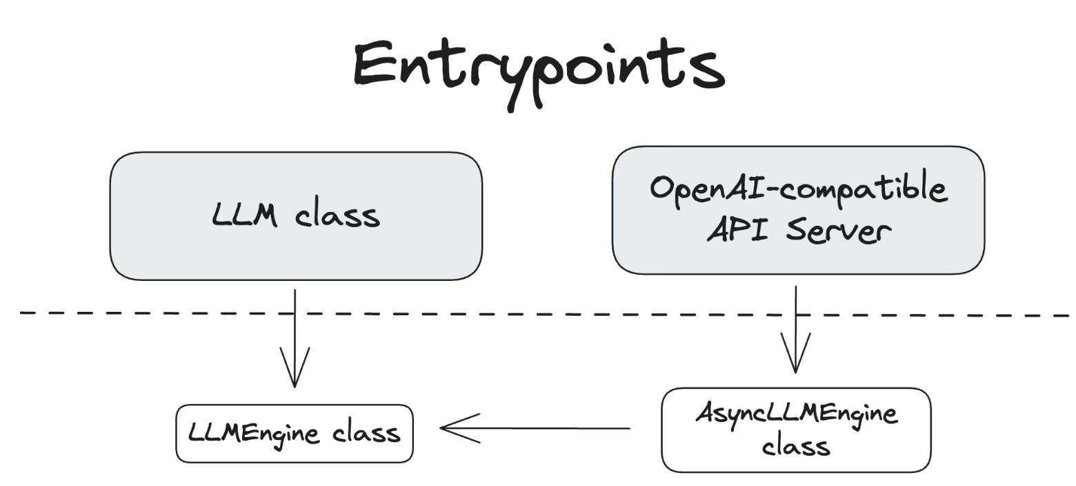 vLLM은 시스템과 상호작용하기 위한 여러 entrypoint를 제공합니다. 아래 다이어그램은 이들 간의 관계를 보여줍니다.