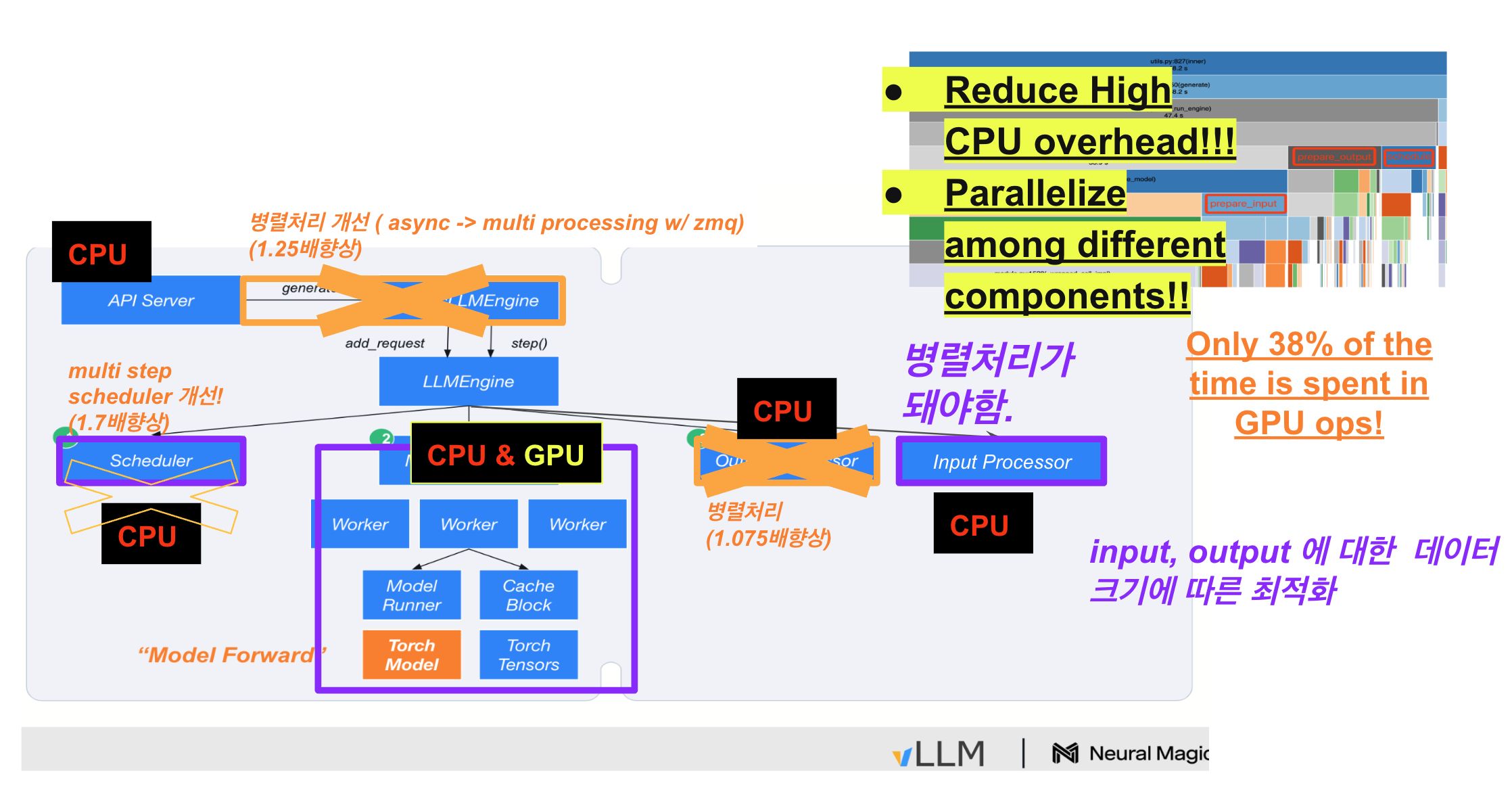 vLLM의 CPU 구성 요소가 예상보다 많은 시간을 소비하고 있습니다. 이는 vLLM 코드가 이해하기 쉽고 기여하기 용이하도록 Python 중심으로 작성되었기 때문입니다. Python의 네이티브 데이터 구조(예: Lists와 Dicts)를 많이 사용하는 것이 스케줄링 및 데이터 준비 시간 증가로 이어졌습니다. - 비동기화 부족