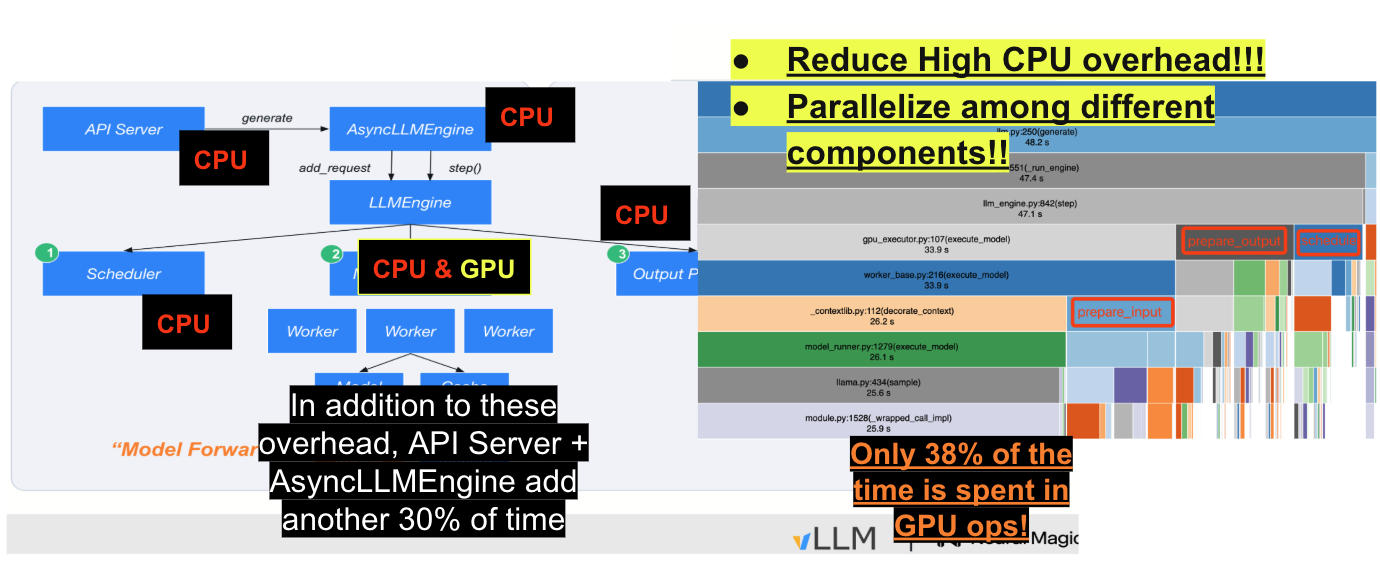 vLLM의 여러 구성 요소(예: 스케줄러 및 출력 처리기)가 GPU 실행을 차단하는 동기 방식으로 실행되고 있습니다. 동기 방식은 GPU가 CPU 작업을 기다리게 만들어 GPU 활용도를 낮추는 문제를 발생시켰습니다.