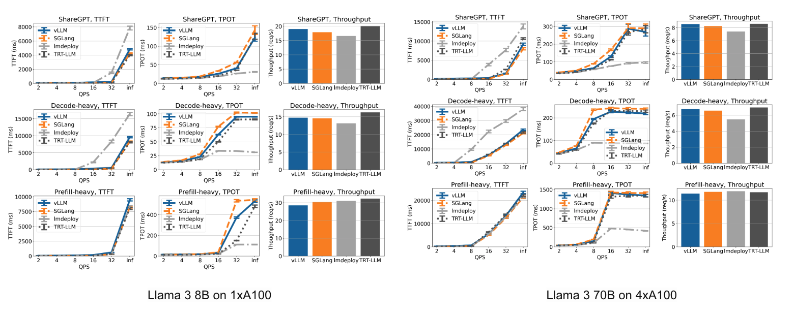 - 서빙 엔진: vLLM v0.6.0을 TensorRT-LLM r24.07, SGLang v0.3.0, 그리고 lmdeploy v0.6.0a0와 비교하여 벤치마킹.