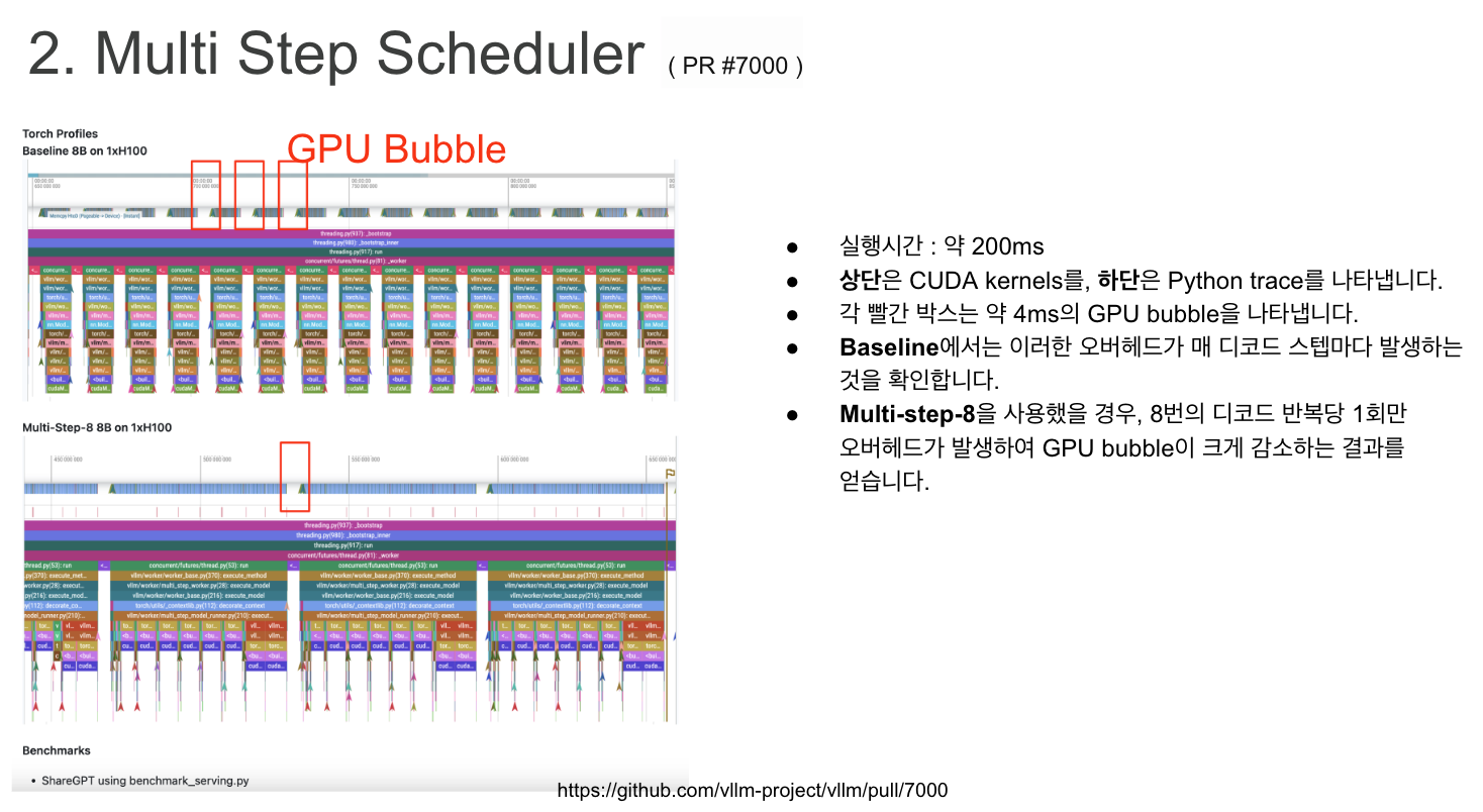 이를 해결하기 위해 vLLM v0.6.0에서는 이러한 오버헤드를 최소화하기 위한 일련의 최적화 방안을 도입한게 이번 변경점의 포인트라고 보시면 될것같습니다.