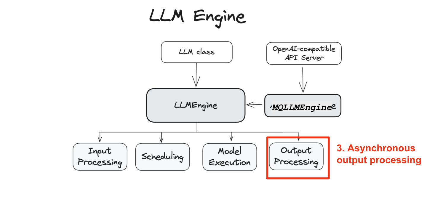LLMEngine은 input processing, , scheduling, model execution(다중 호스트와/또는 GPU에 걸쳐 분산 실행될 가능성이 있음) 그리고 output processing을 포함합니다.