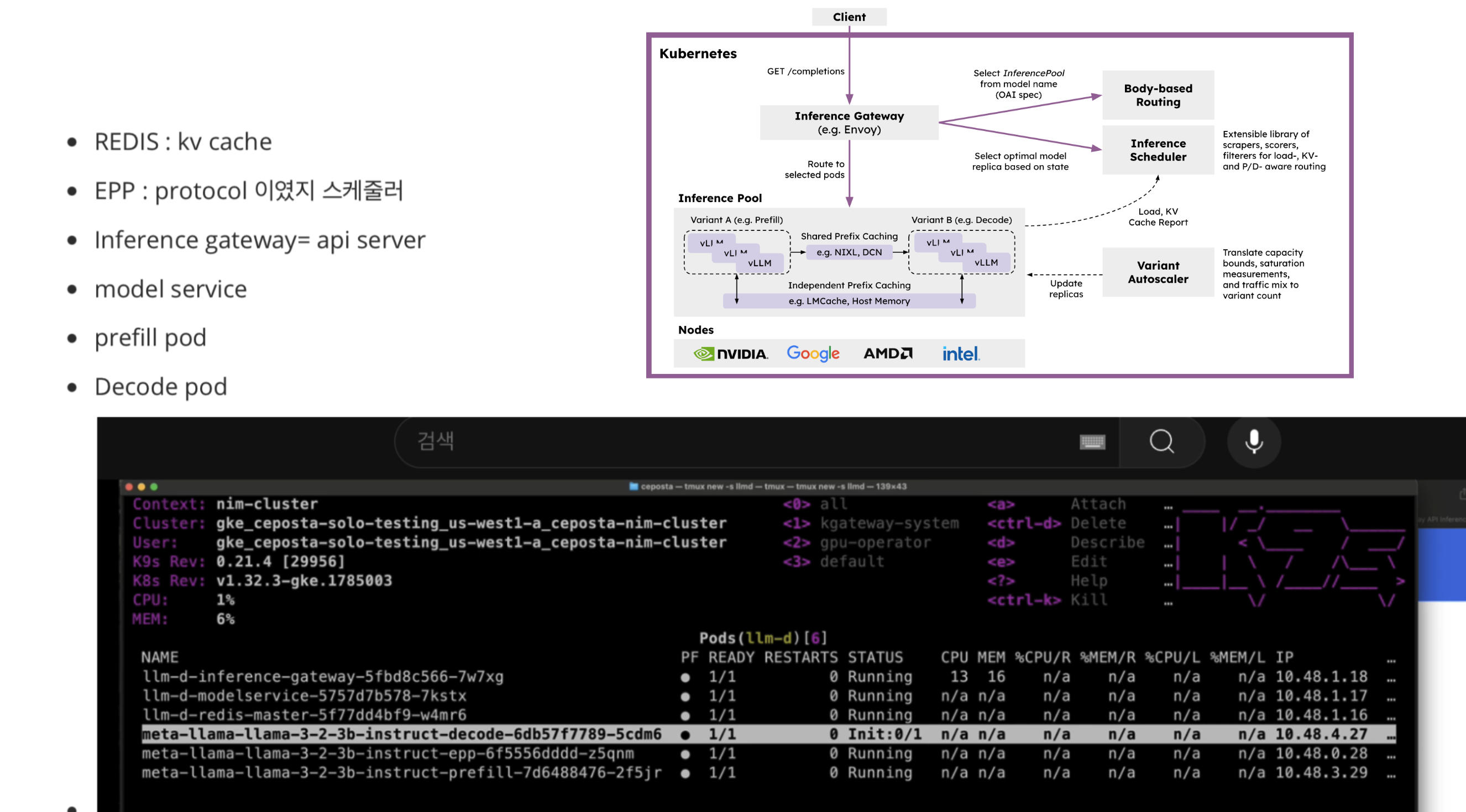 즉, llm-d 는 쿠버네티스 개발자들이 현존하는 멀티노드 llm 서빙툴을 차용해 확장 가능하게끔 구현한 멀티노드 llm 서빙툴입니다.